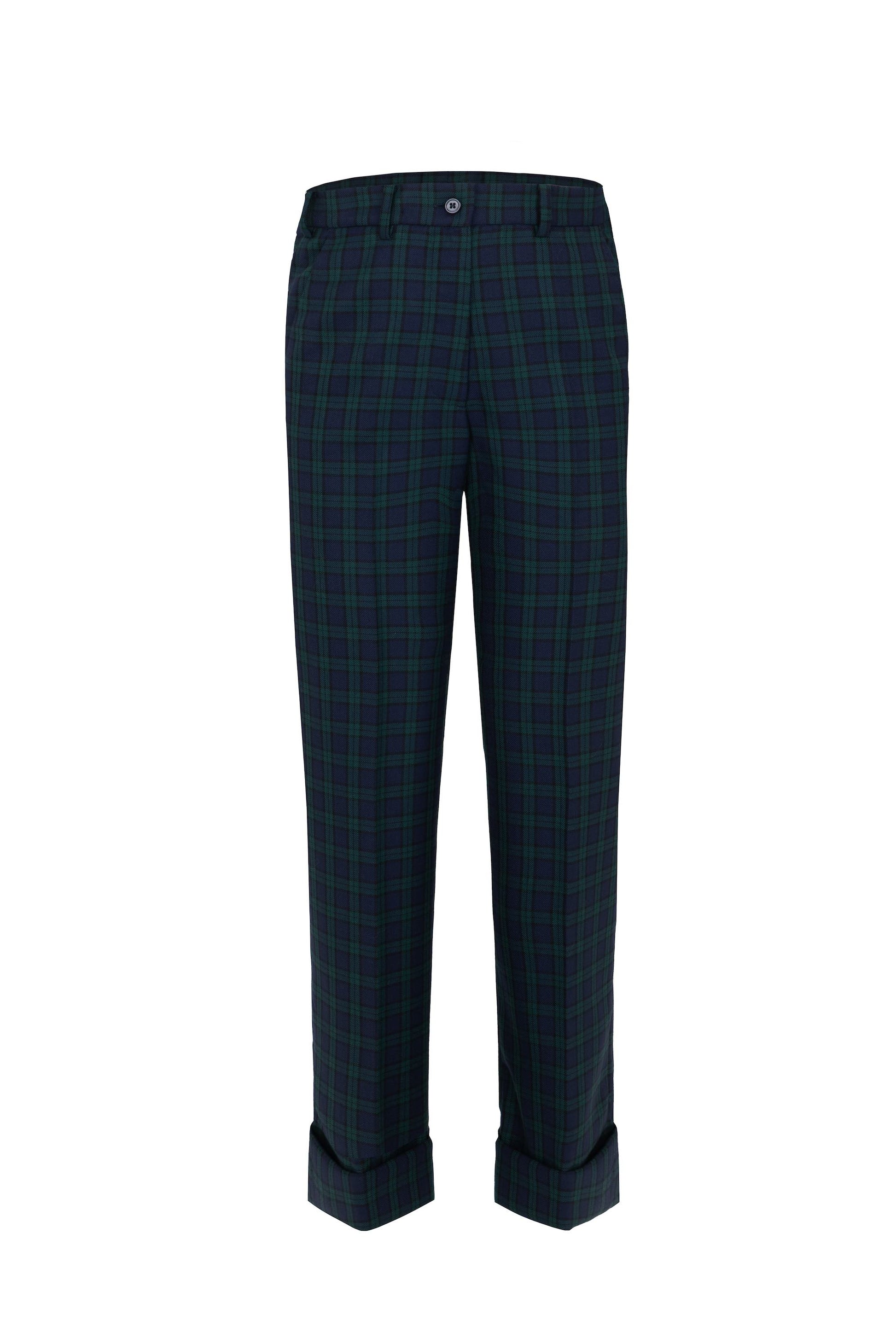 Un omaggio alla tradizione sartoriale italiana con un richiamo sottile alle silhouette maschili degli anni Settanta. Questi pantaloni flare in tartant di pura lana vergine con motivo Black Watch hanno una linea morbida e precisa: la vita alta valorizza la figura con eleganza, il fondo svasato con risvolto aggiunge una nota rétro. Le tasche laterali e il bottone in madreperla completano un capo d’ispirazione vintage, pensato per attraversare il tempo con stile.